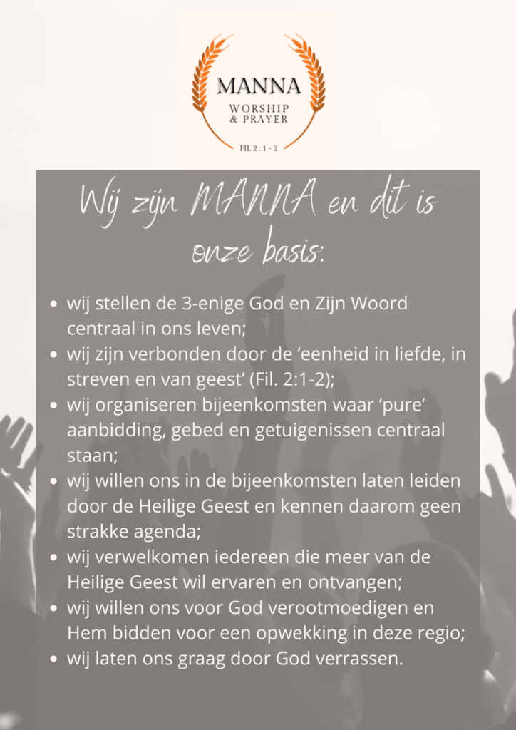Hieronder hebben wij het manifest opgenomen dat wij als kernteam van MANNA Worship & Prayer hebben opgesteld.